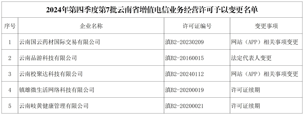 2024年第四季度第7批云南省增值电信业务经营许可予以变更名单