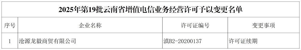 2025年第19批云南省增值电信业务经营许可予以变更名单