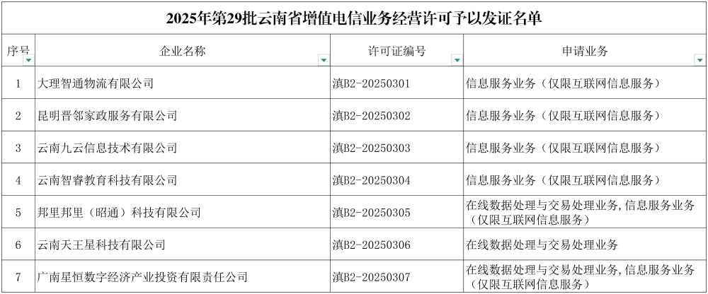 2025年第29批云南省增值电信业务经营许可予以发证名单