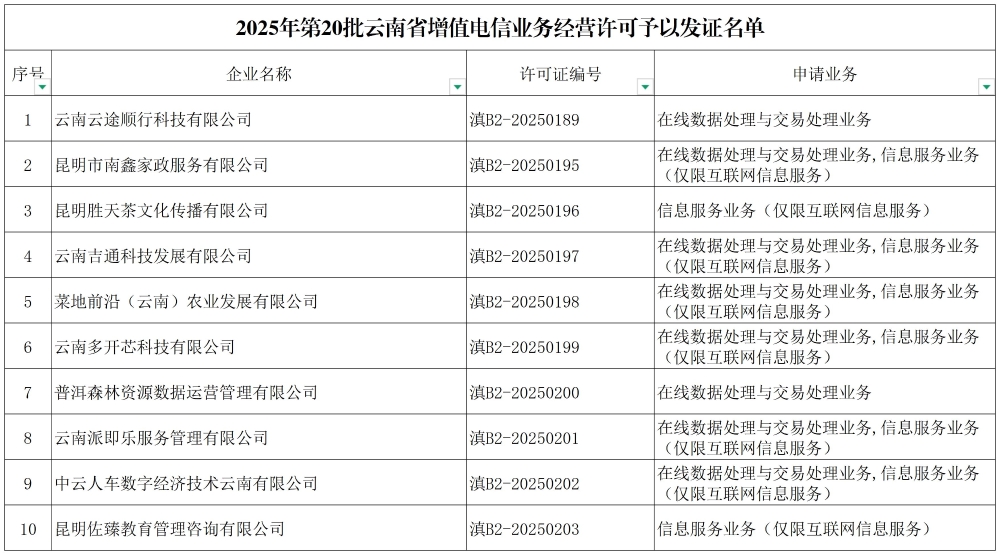 2025年第20批云南省增值电信业务经营许可予以发证名单