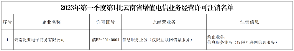 2023年第一季度第1批云南省增值电信业务经营许可注销名单