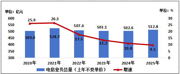 按照上年不变单价,全省2025年电信业务总量512.8亿元,全国排名第15。同比增长9.5%,高于全国0.4个百分点,全国排名第15。