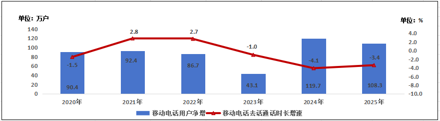 图3-2 2020-2025年移动电话用户和通话量增长情况