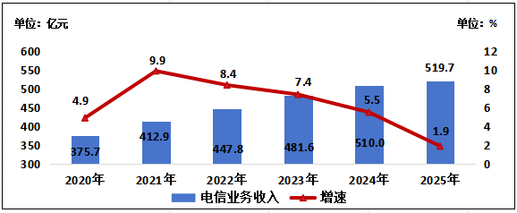 2025年,全省电信业务收入累计完成519.7亿元,同比增长1.9%。增速全国排名第3,比全国平均水平(0.7%)高1.2个百分点。