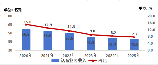 2025年,完成固定话音和移动话音收入共40.0亿元,在电信业务收入中总占比7.7%,较上年末下降0.5个百分点。其中固定话音收入2.1亿元,同比增长2.0%;移动话音业务收入37.9亿元,同比下降4.5%。