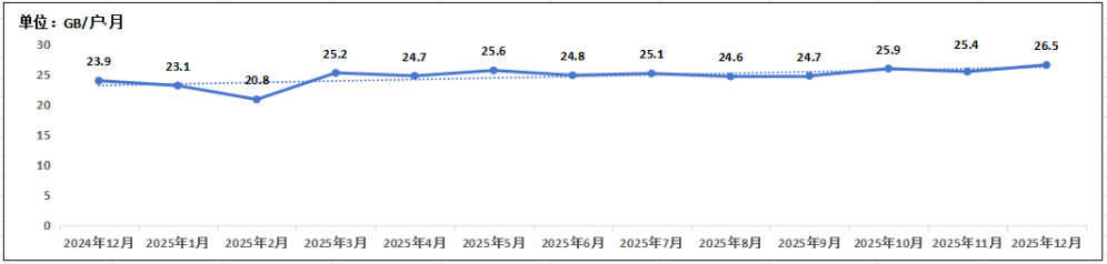 图3-1 2024年12月—2025年移动互联网接入流量当月DOU情况