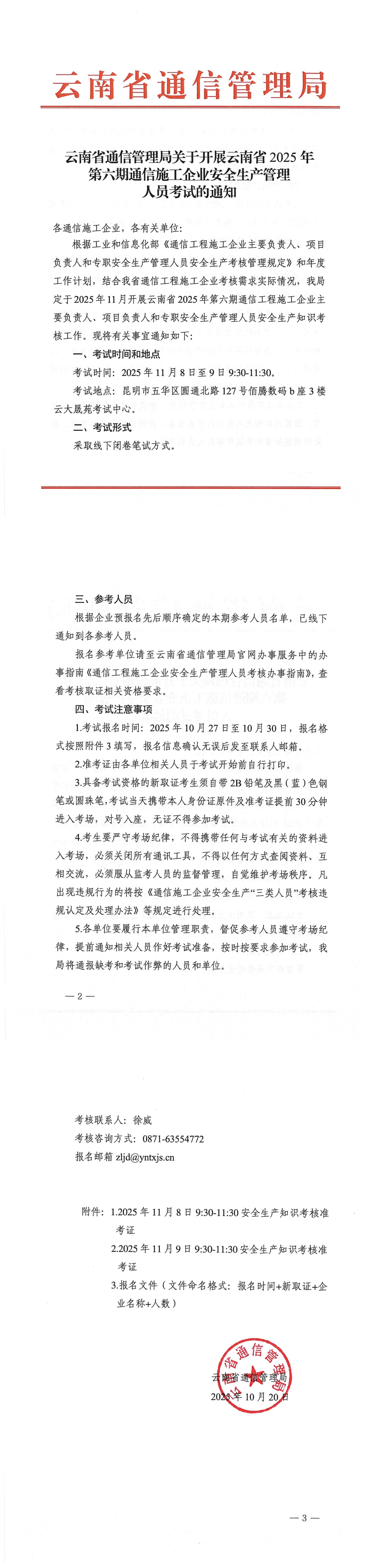 附件1:2025年11月8日9:30-11:30安全生产知识考核准考证.docx 附件2:2025年11月9日9:30-11:30安全生产知识考核准考证.docx 附件3:报名文件(文件命名格式:报名时间+新取证+企业名称+人数)(1).xls