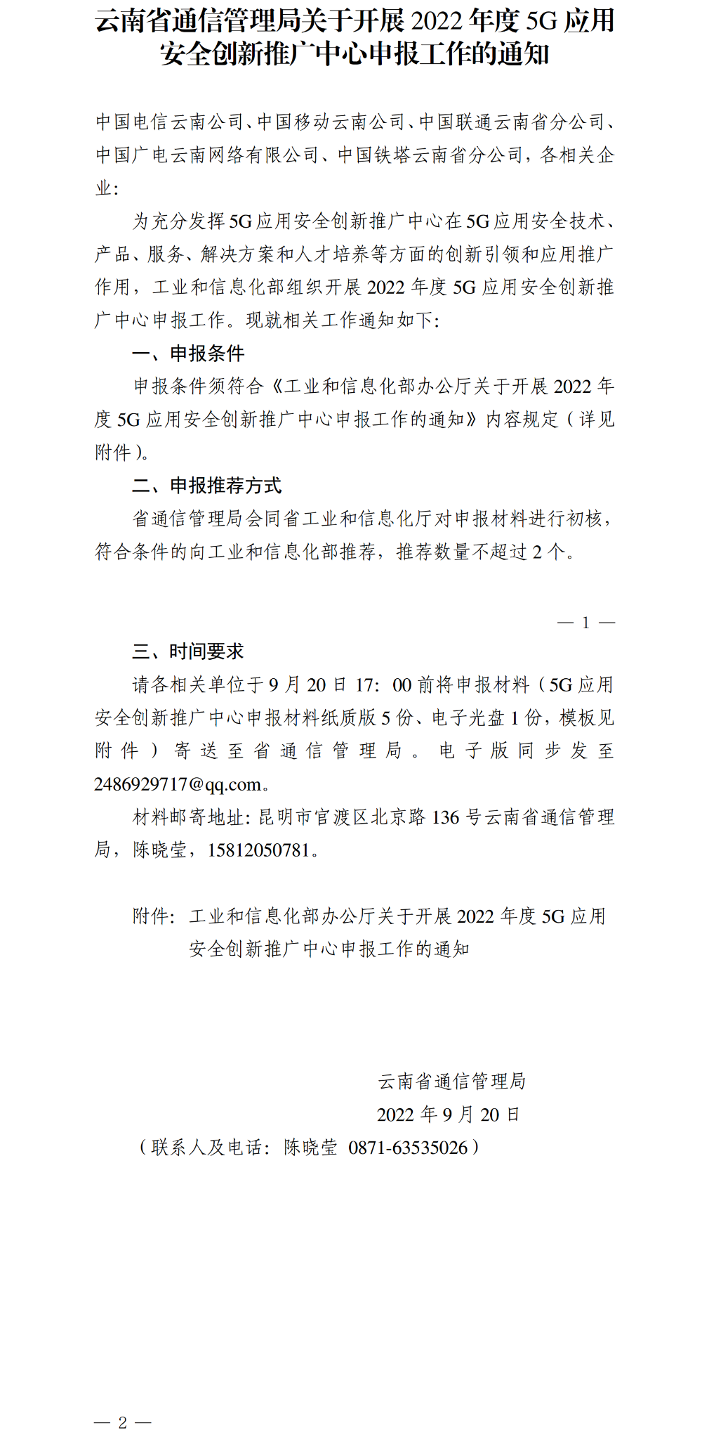 云南省通信管理局关于开展2022年度5G应用安全创新推广中心申报工作的通知