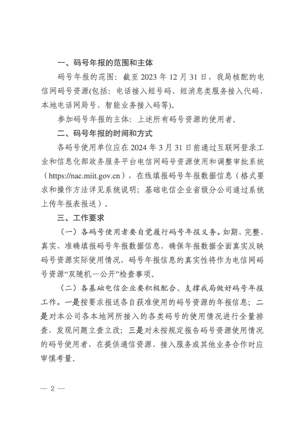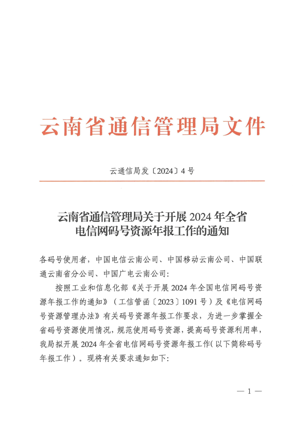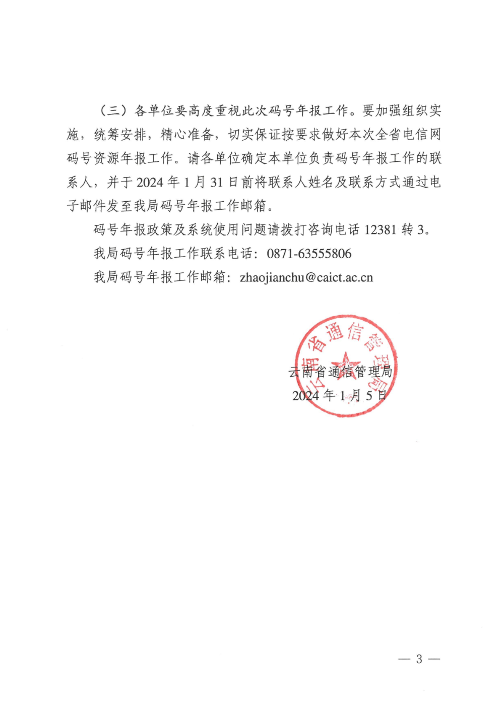 云南省通信管理局关于开展2024年全省电信网码号资源年报工作的通知