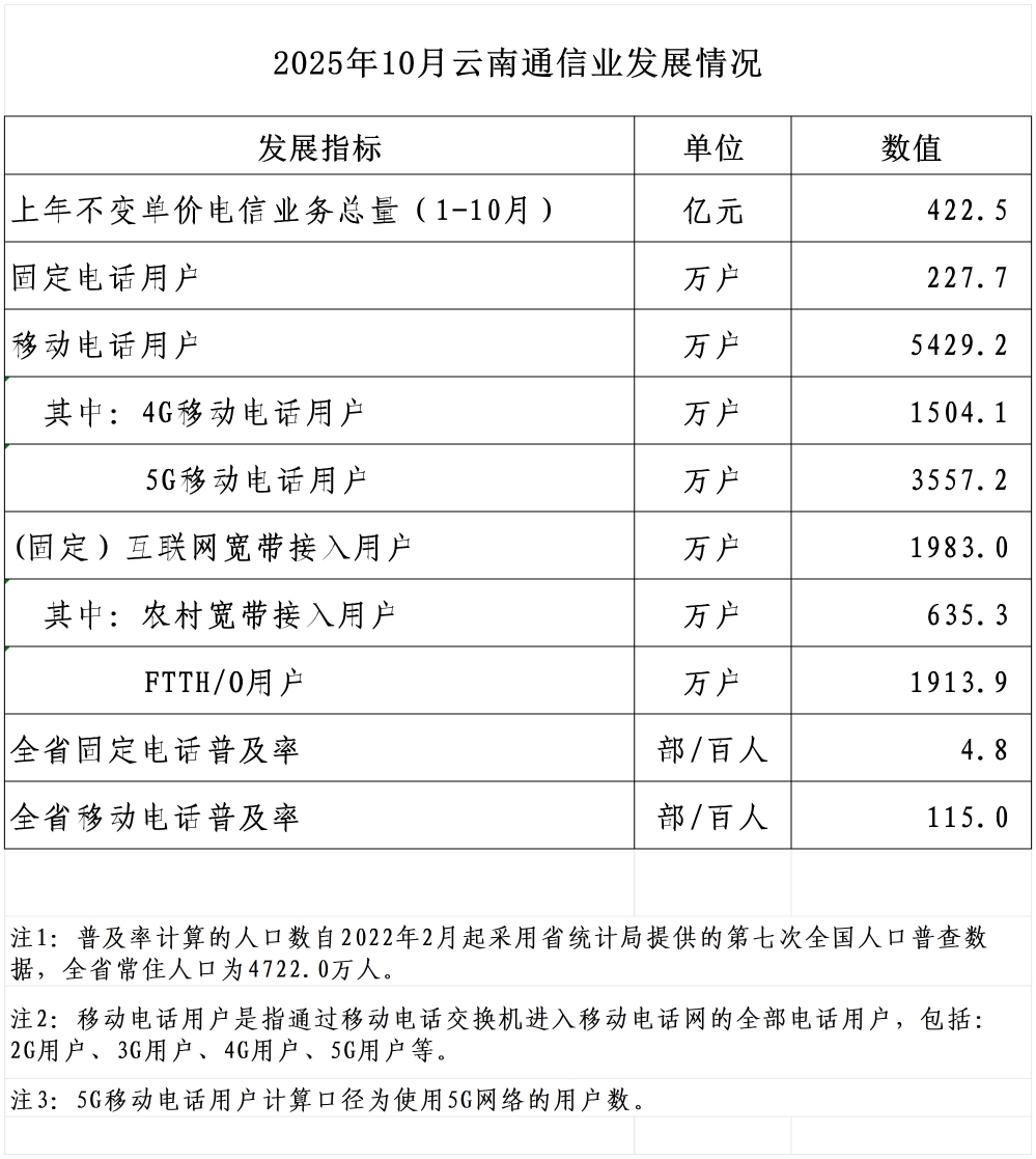 2025年10月云南通信业发展情况